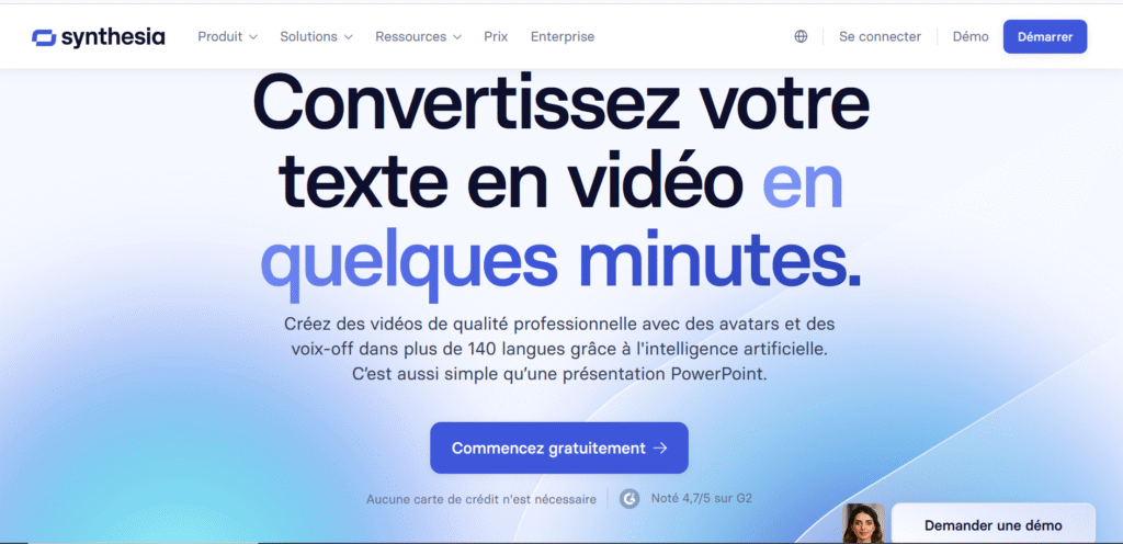 💡 Notre avis d’expert : Comme l’indique notre test complet de Synthesia, c’est l’outil le plus mature du marché pour les vidéos corporate.
