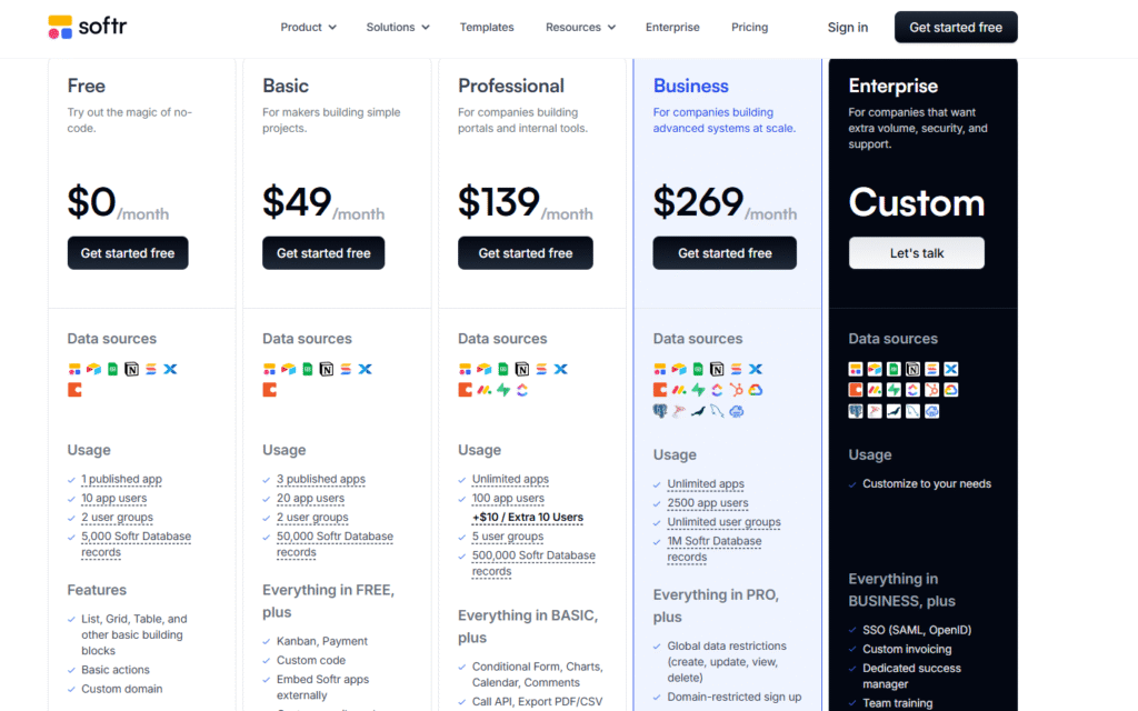 Noloco s’adresse aux projets complexes avec des logiques métiers avancées, des permissions dynamiques (ex. : accès conditionnel à des données) et des sources multiples (SQL, Airtable…). Il intègre même des workflows pilotés par l’IA. Softr reste incontournable pour 80 % des cas grâce à sa simplicité. Son modèle de tarification abordable (gratuit + plans démarrant à 49 $/mois) le rend accessible à tous. 🚀
