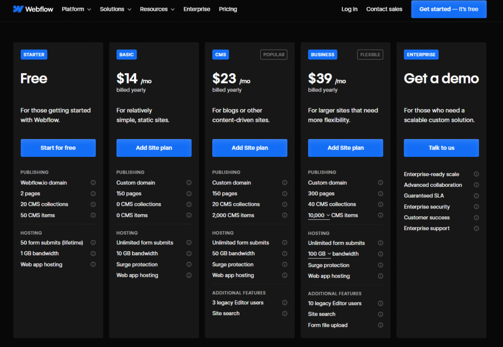 La tarification de Webflow repose sur deux axes : les Plans de site (hébergement et fonctionnalités) et les Plans d’espace de travail (collaboration). 🛠️